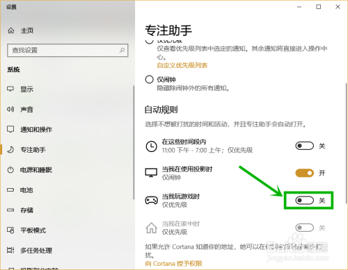 在右侧的专注助手设置详情界面找到主动法则,然后将第三项“当我玩游戏时”后面的按钮封闭就行了