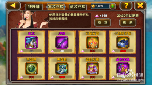 铁匠铺中紫装兑换里面破费30个紫装精髓可以换取一个紫装。