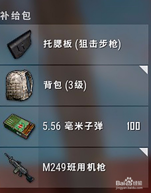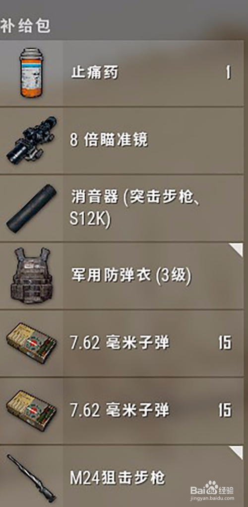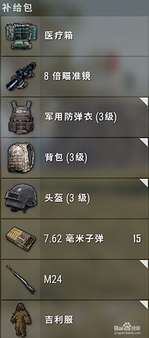 本家儿要:三级头盔、防蛋衣、背包,吉利服,4、8、15倍镜,销音器,托腮板,肾上腺素,止痛药,医疗箱,M249轻机木仓,AUG,groza,MK14,M24,AWM等等。