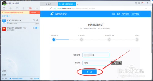 接着,我们在密码找回填写账号页面,填写好本身的账号和验证码,点击“下一步” 按钮,进入到平安验证页面 。