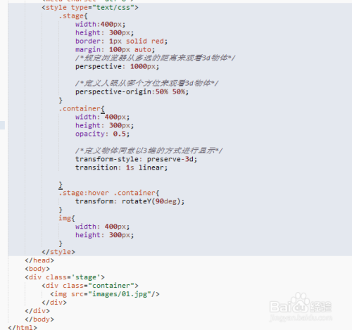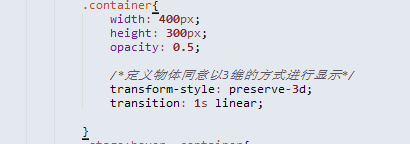 节制容器, 大小 透明度 之类的都是为了样式都雅;关头是 transform-style:preserver-3d;(让容器变为 3d 容器);transition:1s linear; (这个是节制过渡结果,让其可以天然的实现动画结果)