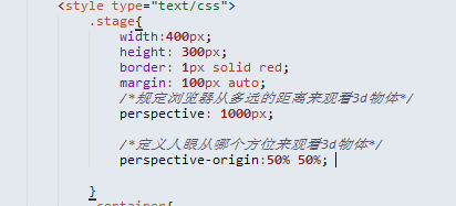 然后我们节制关头样式,舞台 stage ,这是展示 3D 结果的处所,就是和它的名字一样;关头的属性 就是 perspective (视距) perspective-origin(视点),其他的大小边框都是按照本身需求可以变更;