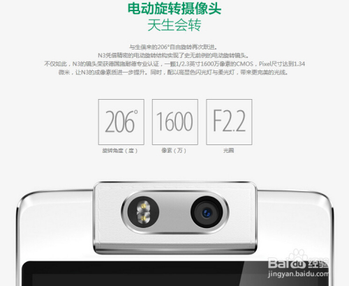 OPPO N3“生成会转”,该机配备1600万像素德国施耐德专业认证镜头,搭配1/2.3英寸传感器和F2.2光圈,撑持主动全景和先摄影后对焦。