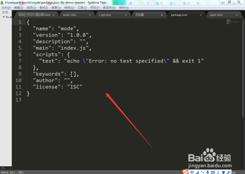 然后再输入:【package.json】,按回车键,用开辟东西打开【package.json】;可以查看到经由过程npm号令操作生当作的一个默认的package.json设置装备摆设文件。如图: