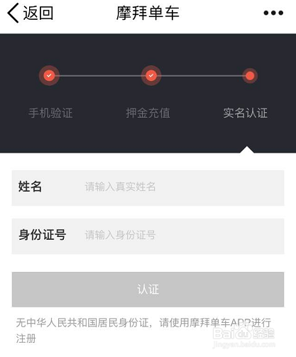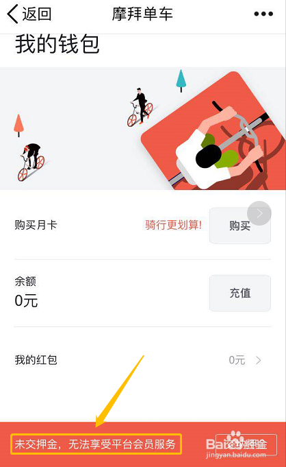 若是我们之前的手机号和身份证号都没有注册过跪拜,那么输入这些信息今后,系统会提醒我们认证当作功,返回到跪拜单车首页就可以骑行了,点击我的钱包下方会提醒我们"未交押金,无法享受平台会员办事",别担忧,此时我们是可以骑车的,只是没法介入跪拜进行的一些活动罢了,如图;