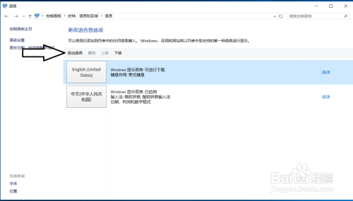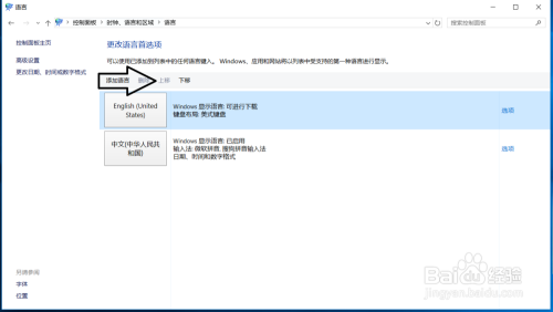 设置页面里选择“英语(美国)” ,并点击“添加”按钮;