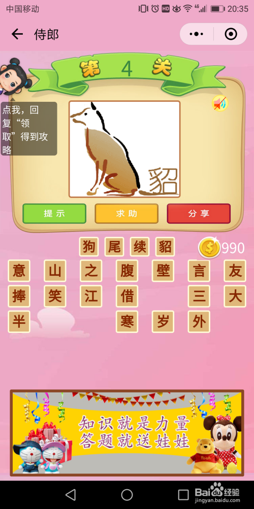 侍郎第4关谜底:这一关有点难度,小编是经由过程提醒信息才找到的谜底【狗从头至尾续貂】。