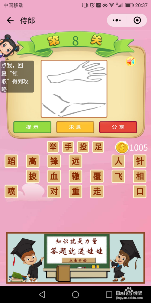侍郎第8关谜底:页面只有手和脚两个信息,只能按照本身想到的当作语用下面的字来试了,试出来谜底是【举手投足】。