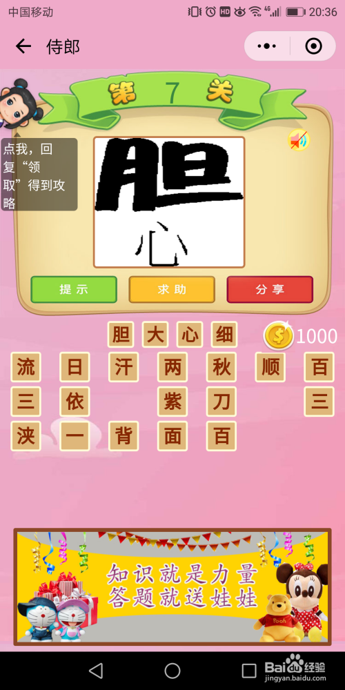 侍郎第7关谜底:这类题都已经有纪律了,就是看字的粗细和颜色深浅,找到这个纪律就能猜到谜底是【胆大心小】。