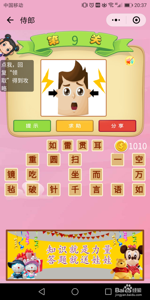 侍郎第9关谜底:页面上有两道闪电,经由过程闪电我们想到雷声。而两个箭头指标的目的耳朵,那么就是雷声传进了耳朵,这种环境就是【如雷贯耳】。
