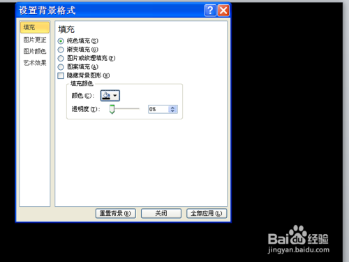 首先启动ppt2010,新建一文档,设置布景颜色为黑色。