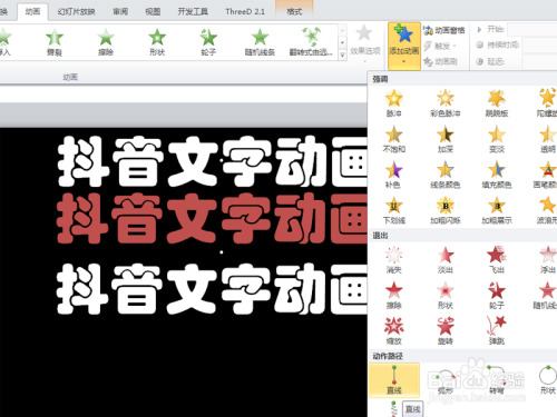 选择中心的文字设置字体颜色为浅红色,选择最上面的文字,执步履画-添加动画,选择直线动画。