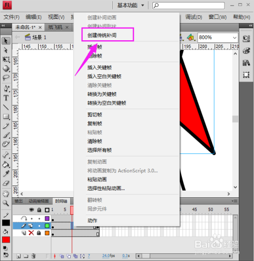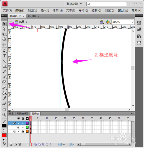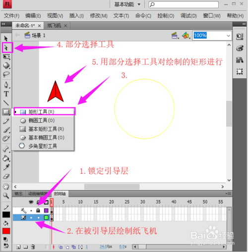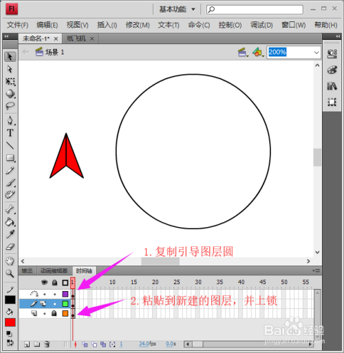 纸飞机绘制好了后,我们再新建一个图层,将指导层的圆复制到该图层上,因为指导层绘制的图形是不成见的,如图所示