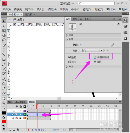 在被指导层,鼠标右击选择“建立传统补间”,接着在属性里,点击“调整到路径”,如图所示