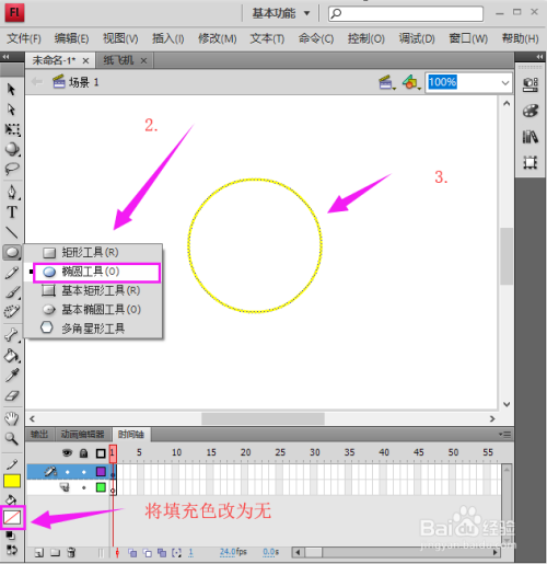 在指导层中绘制一个正圆。点击东西箱中的椭圆东西,按住shift键,在舞台绘制一个正圆,注重将填充色改为无,如图所示