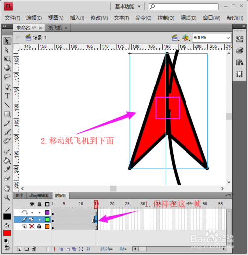 然后,我们在15帧位置,按F6,其他图层按F5,接着,移动纸飞机到缺口的下一部门,如图所示
