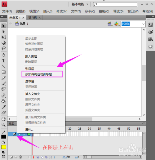 首先,打开软件,在图层面板新建一个图层,然后,鼠标右击选择“添加到指导层”,如图所示