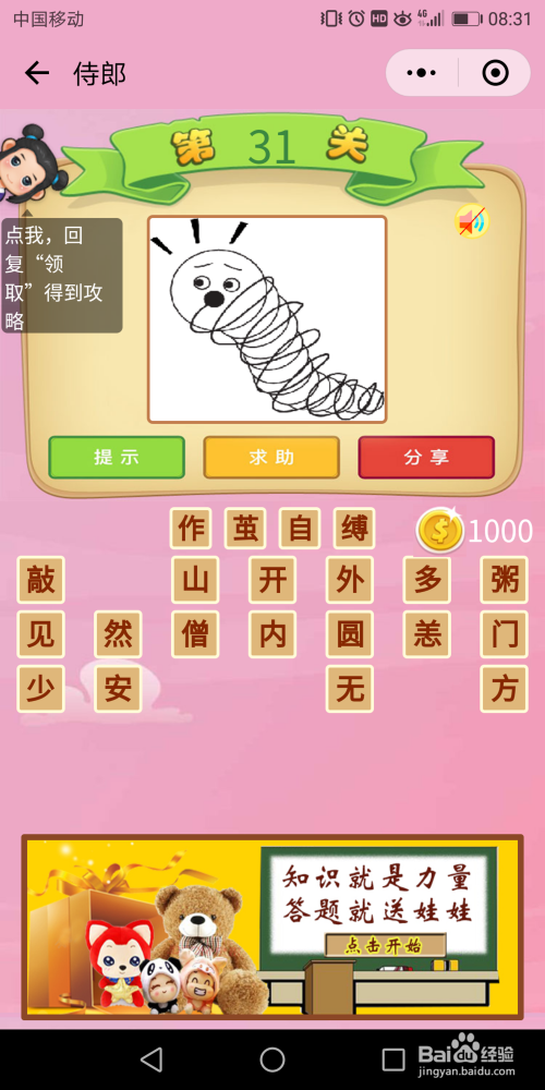 侍郎31关谜底:一条虫子在干什么呢?在吐丝,吐出来的丝来做什么呢?来作茧。这就是【作茧自缚】的活泼写照。