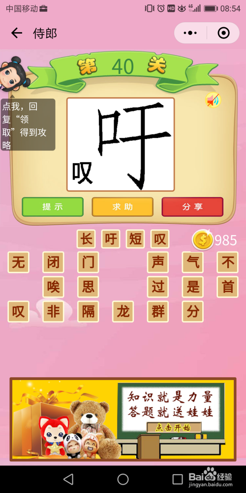 侍郎40关谜底:不雅察文字的大小和高度,猜到谜底是【对天长叹】。