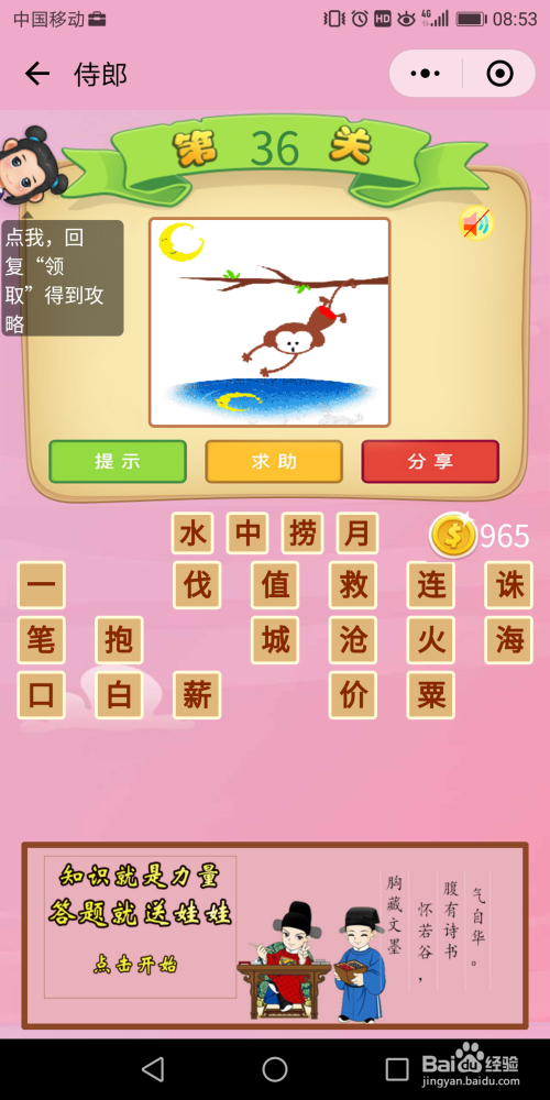 侍郎36关谜底:这是我们学过的讲义上的一副插图,对应的这篇课文名字叫【山公捞月】。