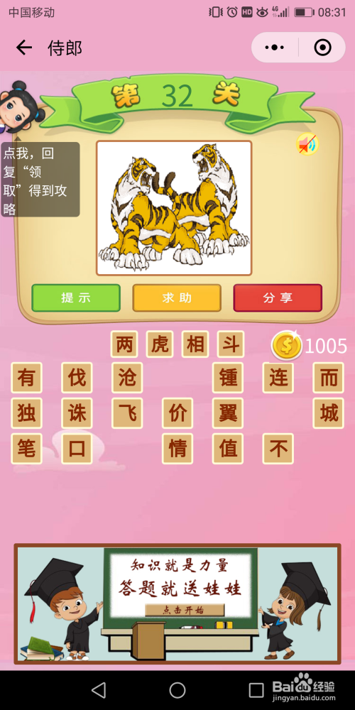侍郎32关谜底:画面上的两只山君在干什么呢?在打斗,打斗就是斗,那么猜到当作语【两虎相斗】。