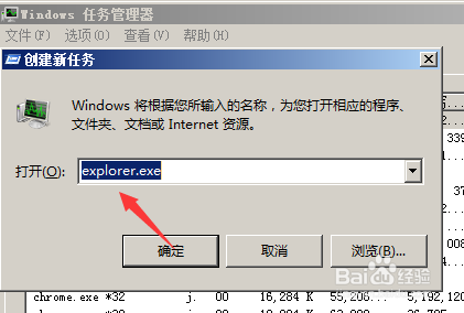 在使命提醒框中,输入explorer.exe号令,如下图所示。
