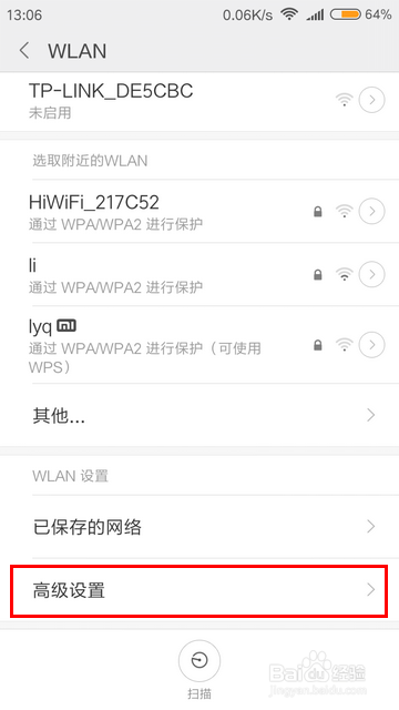 在“WLAN”中点击进入“高级设置”。