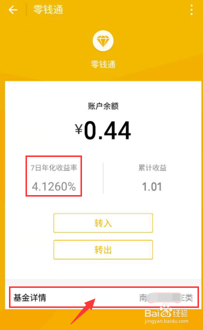 如许即可看到零钱通余额,及对应利率,在图示最下方,有当前该功能对应的基金,点击此行,即可进入详情界面。