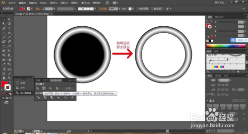 选择椭圆东西绘制一正圆,填充口角渐变,设置渐变属性为径标的目的,并用椭圆东西再绘制一正圆大小刚好是黑色部门大小,居中对齐,按Ctrl+7剪切图形。
