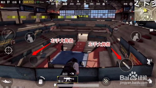 首先讲一下移动射击的键位操作,用右手年夜拇指节制移动,左手年夜拇指节制开仗