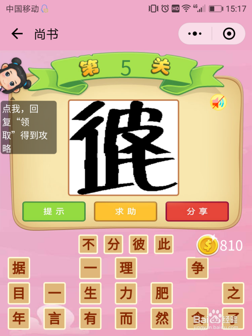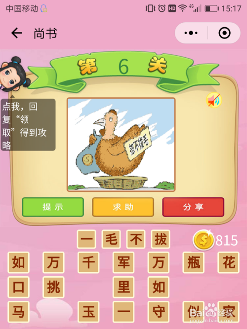 尚书6关谜底:一只鸡不让拔毛,那么就是【爱财如命】。