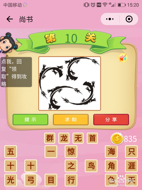 尚书10关谜底:一群龙都没有龙头,那么就是【群龙无首】。