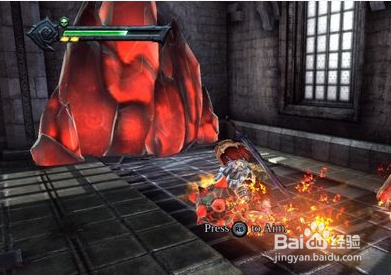 炸开水晶后越过岩浆一路往上爬,会回到刚刚花圃的二楼。用力朝二楼的雕像踢下去,会在花圃的一楼地板摔出一个年夜洞,从洞里跳下去、打垮沿途的骷髅兵士后可以取得一把钥匙,用来打开花圃的蓝色结界