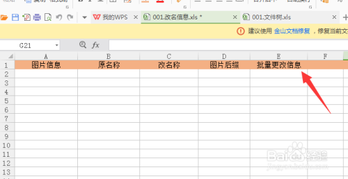 打开001.更名信息.xls,如图,成立图片信息、原名称、更名称、图片后缀、批量更改信息5个栏目。