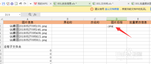 在图片后缀的下一格D2中输入.png(该后缀本家儿要由图片的后缀决议,如图片为.jpgz则需手动更改.jpg)