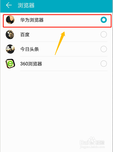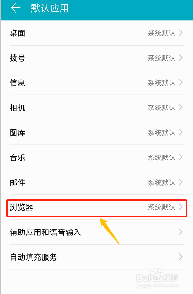 点击这一项会看到"默认应用",然后找到系统默认的浏览器选项,若是我们之前没有做过任何设置,那么此时显示为"华为浏览器",如下图;