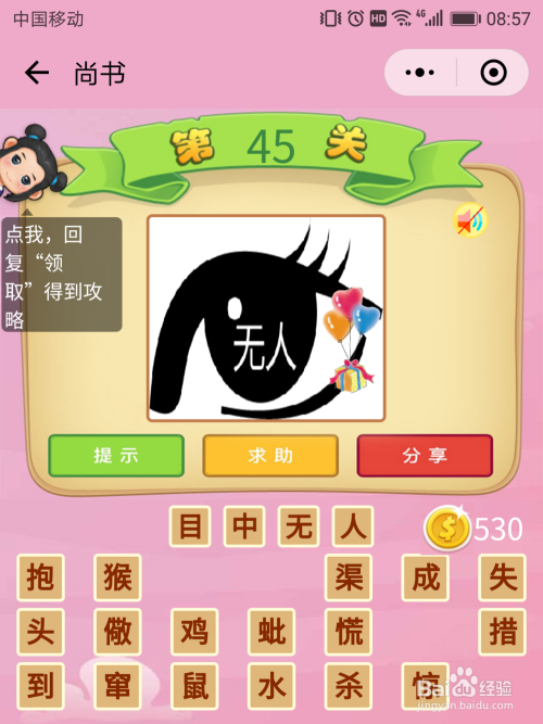 尚书45关谜底:眼睛就是目,那么谜底是【傍若无人】。