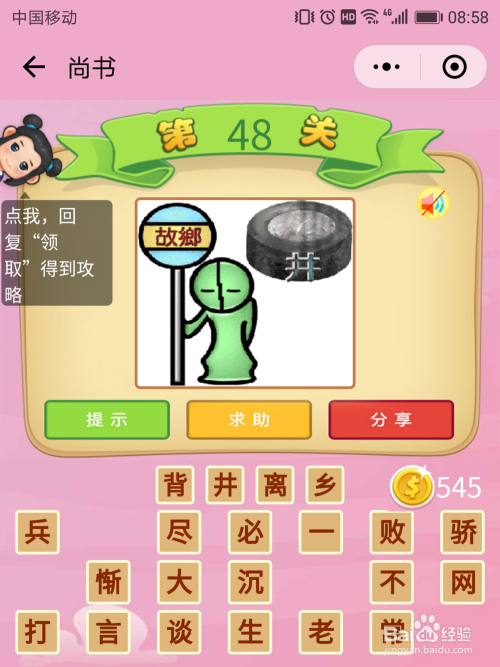 尚书48关谜底:一小我立在了故里牌字旁边,其背后是一口井,立=离,找到谜底【背井离乡】。