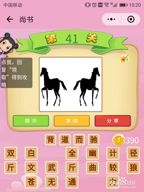尚书41关谜底:图片上这种两匹马标的目的两个相反偏向奔驰的现象叫做【各走各路】。