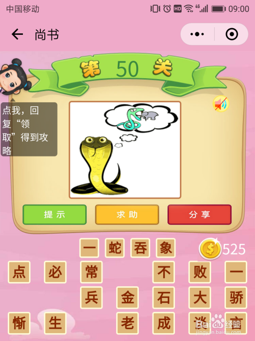 尚书50关谜底:一只蛇想象着把年夜象吃失落,这便是【一蛇吞象】。