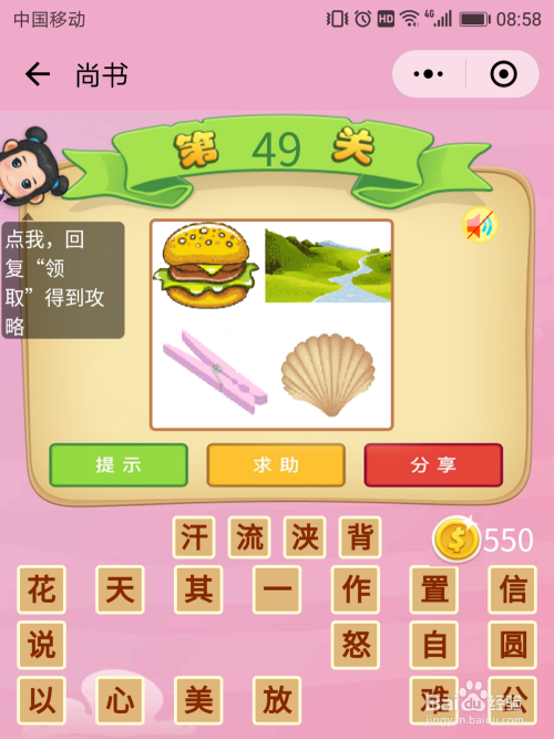 尚书49关谜底:汉堡、流水、夹子、贝壳,取这四个词首字,就是汉流夹贝=【汗如雨下】。