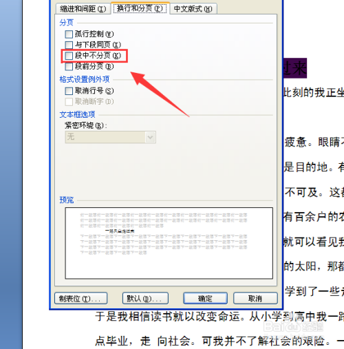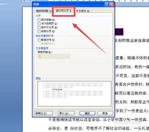 在Word段落对话框中还有一换行和分页的选项卡,本家儿要细节划分有以下几点: