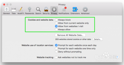您可能还想在Safari的首选项菜单中更改一项设置,即网站跟踪。选中“要求网站不要跟踪我”选项,告诉网站及其第三方内容供给商不要利用Cookie以外的东西跟踪您的浏览活动。Safari会在您拜候该网站时发送“不追踪”请求,但网站所有者必需遵守。