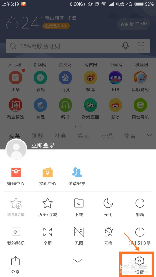 [第二步] 在弹出的菜单界面中,我们需要找到设置按钮,可以看到设置按钮在右下角,此时单击“设置”选项,打开浏览器设置界面
