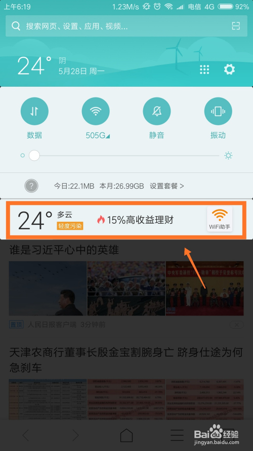 [第五步] 打消勾选今后,我们保留设置,打开手机通知栏,可以看到带有气候和告白通知页东西条已经没有呈现了,这申明我们已经设置当作功了。