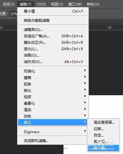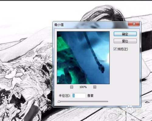 如图示,调出滤镜中“最小值”号令,设置“半径”,单击“确定”按钮。