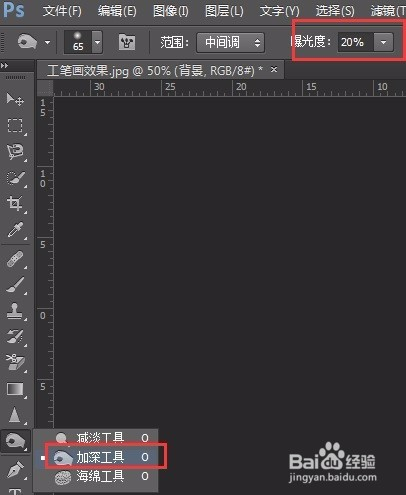 选择“布景”图层,选择加深东西,在属性栏设置“曝光度”为20%,在人物身上涂抹,增添线条。