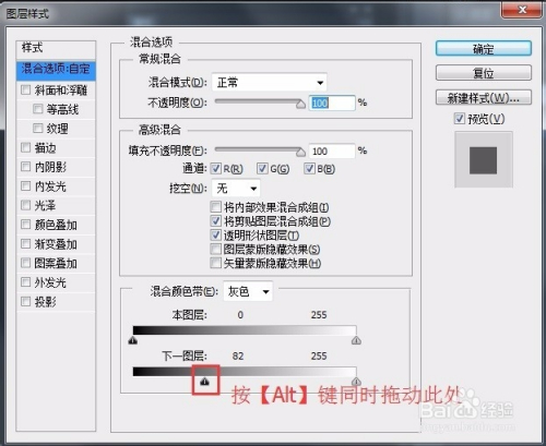 单击“添加图层样式”按钮,选择“夹杂选项”选项,按住【Alt】键同时拖动“下一图层”滑块,调整滑块的位置,使下面的图层和本图层进行必然得融合。