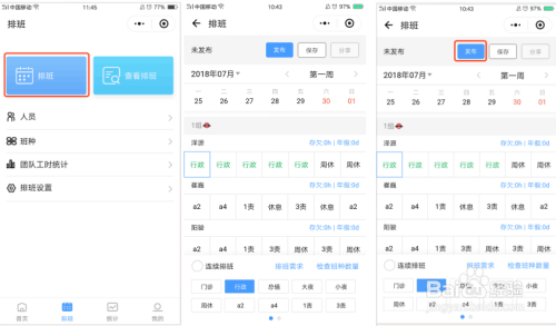 排班完当作后,点击【发布】即可完当作排班表的发布。并分享给团队当作员,团队当作员即可查看排班表