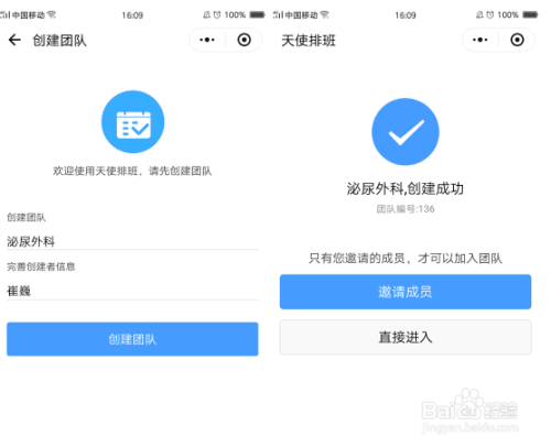 二、建立团队输入“团队名称”和“建立者姓名”,点击【建立团队】。建立完当作后,点击【直接进入】,即可进入天使排班